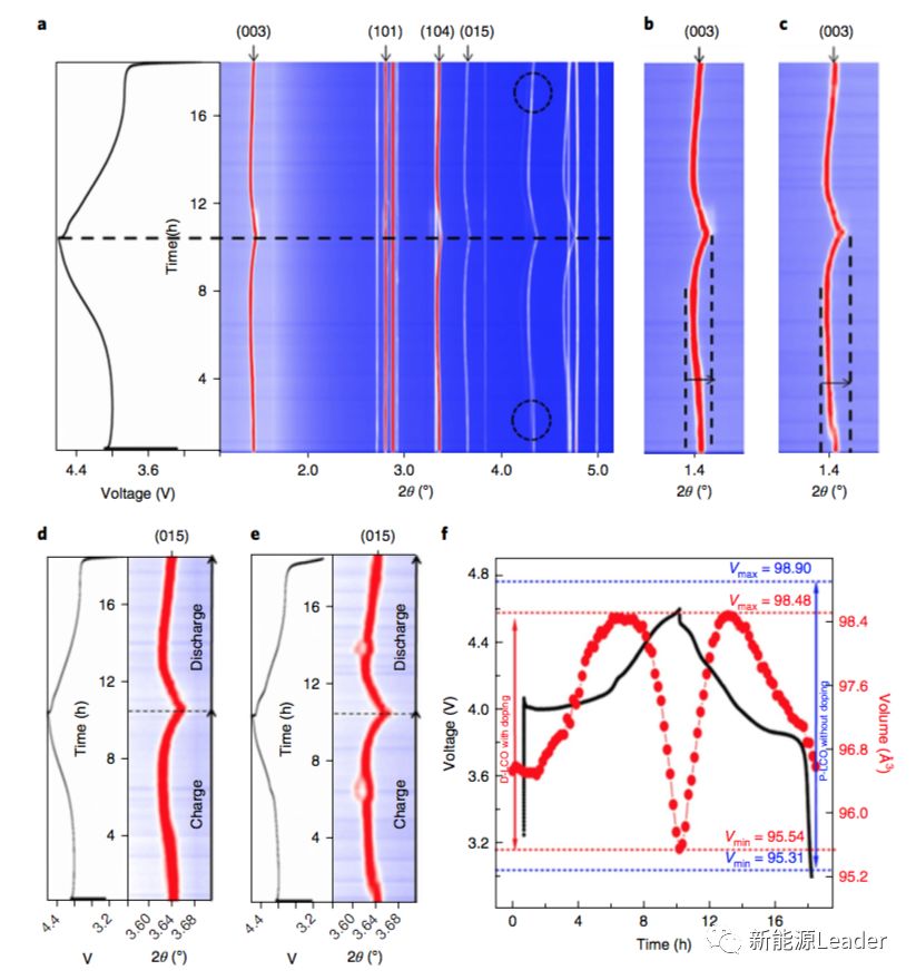 原位X涉嫌衍射分析揭示了LA、Al摻雜提高LCO材料循環(huán)性能的原因,從下圖中能夠看到摻雜后的LCO材料除了在低電壓范圍內(nèi)有一個(gè)絕緣體-金屬導(dǎo)體的轉(zhuǎn)變外,在整個(gè)電壓范圍內(nèi)都是單相固溶體結(jié)構(gòu),而沒(méi)有摻雜的LCO材料在整個(gè)電壓范圍內(nèi)發(fā)生了一系列的相變反應(yīng)。從下圖b和c來(lái)看在脫Li的過(guò)程中沒(méi)有摻雜的LCO材料的晶胞參數(shù)c變化明顯要好于經(jīng)過(guò)摻雜的LCO材料,因此導(dǎo)致沒(méi)有摻雜的LCO在脫Li過(guò)程中晶胞體積膨脹達(dá)到3.63%,而經(jīng)過(guò)摻雜處理的LCO僅為2.97%,這極大的減少了LCO在脫Li過(guò)程中顆粒內(nèi)部和顆粒之間應(yīng)力的產(chǎn)生,提升了LCO材料的循環(huán)性能。
