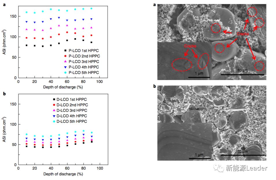 通過(guò)對(duì)LCO材料的比面電阻進(jìn)行分析發(fā)現(xiàn),沒(méi)有摻雜處理的LCO材料在循環(huán)過(guò)程中比面電阻上升的很快,而經(jīng)過(guò)摻雜處理后的LCO材料循環(huán)過(guò)程中電極的比面電阻僅有輕微的升高,這主要是因?yàn)長(zhǎng)a、Al摻雜很好的抑制了脫Li過(guò)程中的LCO材料的相變,從而減輕了材料中的應(yīng)力,避免了循環(huán)過(guò)程中LCO材料裂紋的產(chǎn)生。而沒(méi)有摻雜的LCO材料由于脫Li過(guò)程中LCO中存在多種相變,因此導(dǎo)致了LCO材料在循環(huán)過(guò)程中積累了大量的應(yīng)力,從而在顆粒表面產(chǎn)生了許多的裂縫,從而加劇了電解液在LCO材料表面的分解,導(dǎo)致電阻迅速增加。