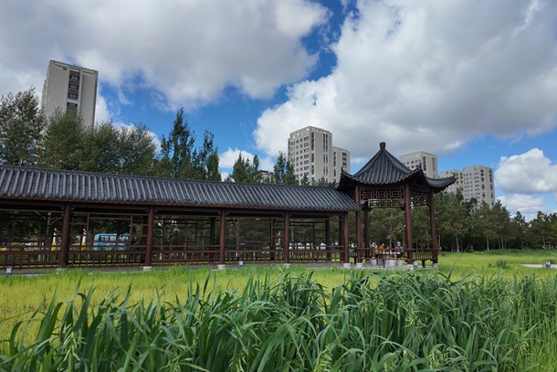 圖為新建公園內(nèi)涼亭及綠化帶
