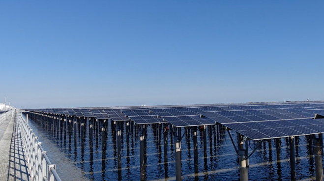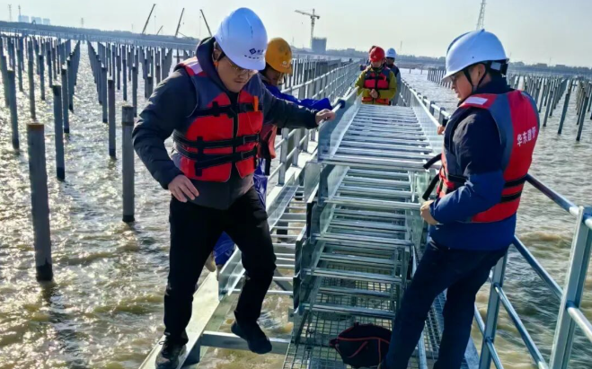 在呂四項目的安全日志里,記錄著大風(fēng)天氣、暴雨預(yù)警、潮汐延誤作業(yè)等不同的數(shù)據(jù),如何在惡劣環(huán)境下確保施工安全與效率,成為貫穿項目始終的必修課。項目團(tuán)隊建立預(yù)警響應(yīng)機(jī)制,以設(shè)計優(yōu)化、工序協(xié)同破解困局,呂四項目的順利并網(wǎng),展現(xiàn)出了他們向海要地、與浪共舞的智慧。通過團(tuán)隊協(xié)作與科學(xué)調(diào)度,不僅成功克服了雨季施工難、大風(fēng)頻發(fā)、潮汐作業(yè)窗口短等多重挑戰(zhàn),更以安全優(yōu)先為前提,實現(xiàn)了工期與質(zhì)量雙達(dá)標(biāo),最終項目以光伏發(fā)電和漁業(yè)養(yǎng)殖相結(jié)合,形成“水上發(fā)電、水下養(yǎng)殖”的復(fù)合產(chǎn)業(yè)模式,在5800畝海域上實現(xiàn)灘涂資源的高效利用和生態(tài)開發(fā)。