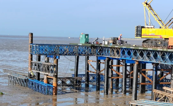 面對潮間帶施工困難的情況,林洋新能源建設(shè)團(tuán)隊將先筑臺、后建站定為首要任務(wù)。根據(jù)施工規(guī)劃,兩座6400平方米的貝雷結(jié)構(gòu)平臺需在1個月內(nèi)建成,項目組實行設(shè)計、施工、監(jiān)測三班倒機(jī)制:技術(shù)組白天駐守現(xiàn)場優(yōu)化鋼管樁打入角度,夜晚核算貝雷架承重數(shù)據(jù);施工隊分成打樁、焊接、防腐三個班組交叉作業(yè),在每日兩次潮水退去的間隙搶工。在團(tuán)隊的齊心協(xié)作下,直徑0.63米的鋼管樁群穩(wěn)穩(wěn)扎入灘涂,連接平臺與海堤的鋼棧橋同步貫通,為后續(xù)近9萬根預(yù)制樁、百萬塊組件的運輸安裝奠定基礎(chǔ)。