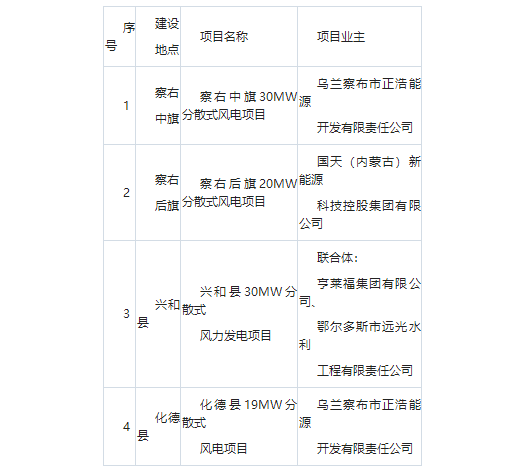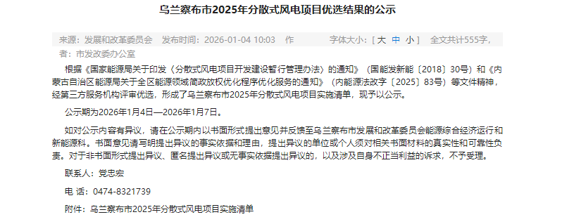 1月4日,內蒙古烏蘭察布發改委公示《烏蘭察布2025年分散式風電項目優選結果》。