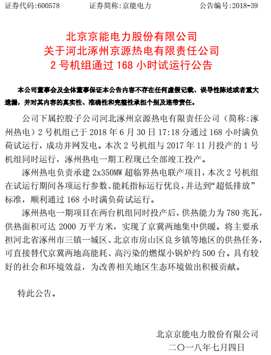 京能電力發(fā)布公告,下屬控股子公司涿州熱電2號機(jī)組已于6月30日17:18分通過168小時滿負(fù)荷試運(yùn)行,成功并網(wǎng)發(fā)電。本次2號機(jī)組與2017年11月投產(chǎn)的1號機(jī)組同時運(yùn)行,涿州熱電一期工程現(xiàn)已全部竣工投產(chǎn)。公告原文: