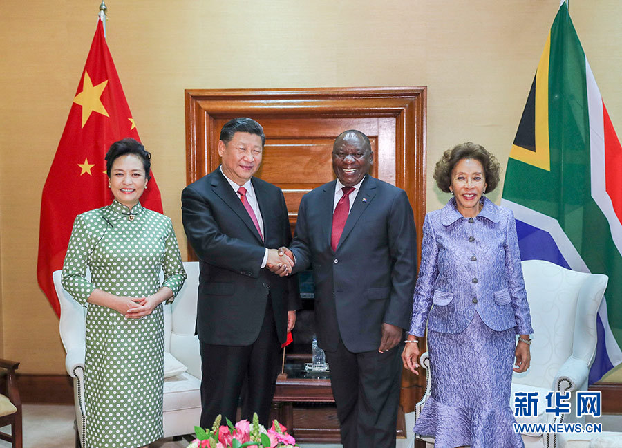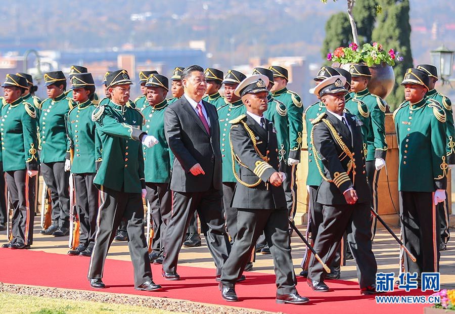 總統(tǒng)府前廣場,微風(fēng)拂面,陽光和煦。中南兩國國旗迎風(fēng)飄揚(yáng)。習(xí)近平和夫人彭麗媛受到拉馬福薩和夫人莫采佩熱情迎接。兩國元首夫婦登上檢閱臺。儀仗隊行持槍禮。軍樂隊奏中國國歌。現(xiàn)場鳴放21響禮炮。習(xí)近平檢閱儀仗隊。軍樂隊奏南非國歌。習(xí)近平和彭麗媛同南方主要官員握手。拉馬福薩夫婦同中方陪同人員握手。兩國元首夫婦親切寒暄。拉馬福薩對習(xí)近平在南中建交20周年之際訪問南非并出席金磚國家領(lǐng)導(dǎo)人會晤表示熱烈歡迎。