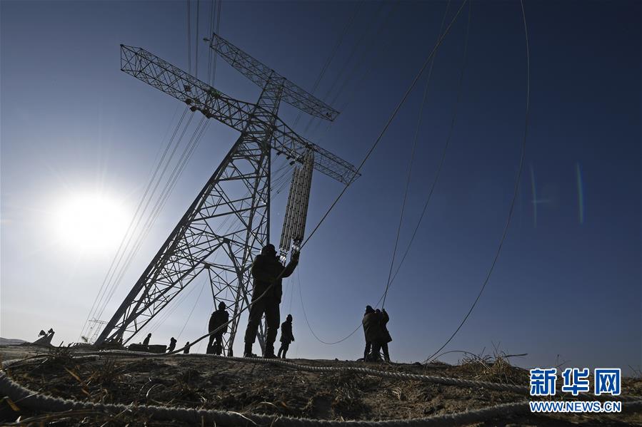 在昌吉——古泉±1100千伏特高壓直流輸電工程寧夏固原段,施工人員進行線路貫通結(jié)尾工程作業(yè)
