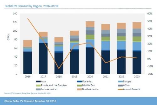 GTM Research最新的“全球太陽能需求監測報告”預計2018年全球太陽能市場將下滑至85.2GW,原因是中國決定在5月底限制其兩個最大市場 - 公用事業規模和分布式發電(DG)。公用事業大幅超前計劃的市場過熱和補貼支付要求。