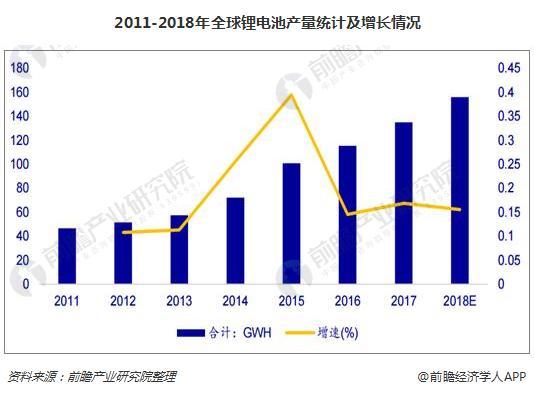 2011年以來(lái),由于能源技術(shù)變革以及新興科技的帶動(dòng)下,全球鋰離子電池產(chǎn)量進(jìn)入飛速增長(zhǎng)期,2012年到2015年增速均超過(guò)50%。2015年全球鋰電池產(chǎn)量100.75GWh,同比增長(zhǎng)39.45%;2017年,鋰離子電池主要應(yīng)用市場(chǎng)增速放緩,增速只有16.85%,但受益于新能源汽車(chē)行業(yè)景氣帶動(dòng)的動(dòng)力電池繁榮,預(yù)計(jì)2018年全球鋰電池增速維穩(wěn),產(chǎn)量有望達(dá)到155.82GWH,市場(chǎng)規(guī)模將到達(dá)2313.26億元。