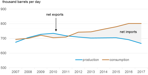 圖12:埃及年度石油及其他石油產品生產,消費,凈出口和凈進口(EIA,2018)