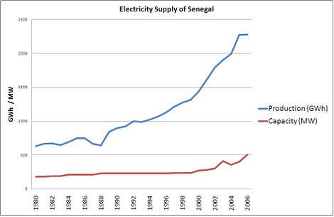 由于電力需求的增長速度遠快于供應,塞內加爾面臨嚴重問題。國家公用事業公司SENELEC缺乏有效的組織結構,缺乏(獲得資金)對發電廠和輸電線路的投資,以應對不斷增長的需求。目前儲備容量不足,導致整個地區頻繁(定期或不定期)停運,而輸電損失,舊火電廠和油價上漲導致平均生產成本高。下圖顯示了隨著時間的推移消費和產能,支撐了上述情況。