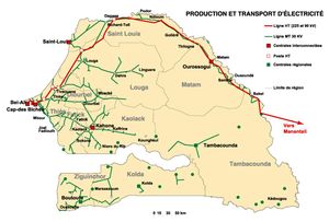 有兩個電網系統:90千伏國家電網和225千伏超國家電網,總計約13,000公里。兩者均由SENELEC管理。該網格主要為達喀爾,提斯,圣路易斯和考拉克/法蒂克周圍的城市供電。但是有幾個孤立的網絡可以為某些偏遠地區供電。