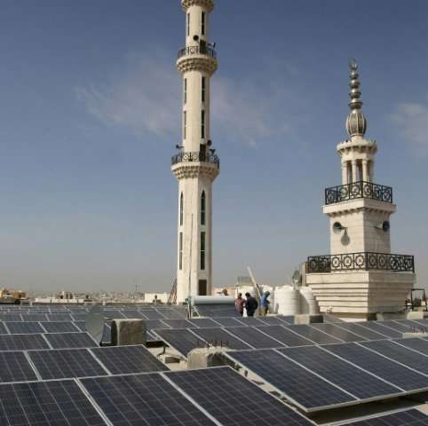 在約旦首都南部的一座清真寺頂上,數(shù)十個(gè)閃閃發(fā)光的太陽能電池板反映了資源匱乏的沙漠王國日益增長的趨勢,因?yàn)樗噲D對抗對進(jìn)口能源的嚴(yán)重依賴。