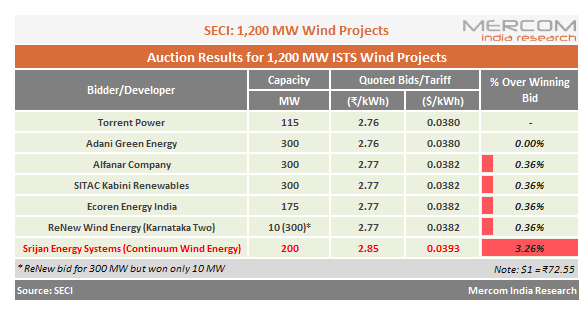 Mercom 之前曾報道,9個項目開發商提交了總計2,190兆瓦的技術出價,其中SECI的Tranche-V ISTS連接風電標簽的容量為1200兆瓦。