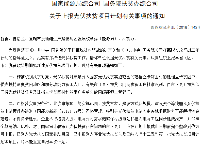 10月10日,國(guó)家能源局綜合司、國(guó)務(wù)院扶貧辦綜合司關(guān)于上報(bào)光伏扶貧項(xiàng)目計(jì)劃有關(guān)事項(xiàng)的通知指出,光伏扶貧對(duì)象是列入國(guó)家光伏扶貧實(shí)施范圍的建檔立卡貧困村的建檔立卡貧困戶,優(yōu)先扶持深度貧困地區(qū)和弱勞動(dòng)能力貧困人口。