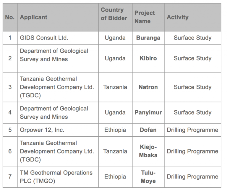 2018年10月17日目前已根據地熱風險減緩基金(GRMF)選擇了七個項目供資。2800萬美元的資金用于坦桑尼亞,烏干達和埃塞俄比亞的地熱項目的地面研究和鉆探。東非地熱風險減緩基金(GRMF)第五輪申請結果已經公布。