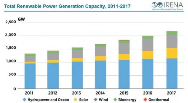 國際可再生能源機(jī)構(gòu)(IRENA)發(fā)布的新數(shù)據(jù)顯示,2017年全球可再生能源發(fā)電容量增加167GW,達(dá)到2179GW。 這意味著一年約增長8.3%。