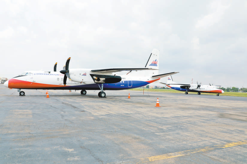 巴戎航空公司的兩架新舟60客機停靠在金邊國際機場。(圖片來源:人民日報 趙益普攝)