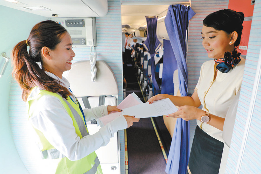 金邊國際機場,在一架即將飛往暹粒的新舟60客機上,巴戎航空公司的工作人員正在交接資料表格。(圖片來源:人民日報 趙益普攝)