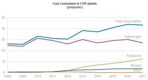 2017年,拉脫維亞熱電聯(lián)產(chǎn)電廠主要消耗天然氣(27.1焦耳(PJ))和薪材(12.4 PJ)。在2008年至2017年期間,熱電聯(lián)產(chǎn)工廠消耗的天然氣份額從94%下降到接近63%,而RES消耗的份額增長了33個(gè)百分點(diǎn),2017年達(dá)到37%。